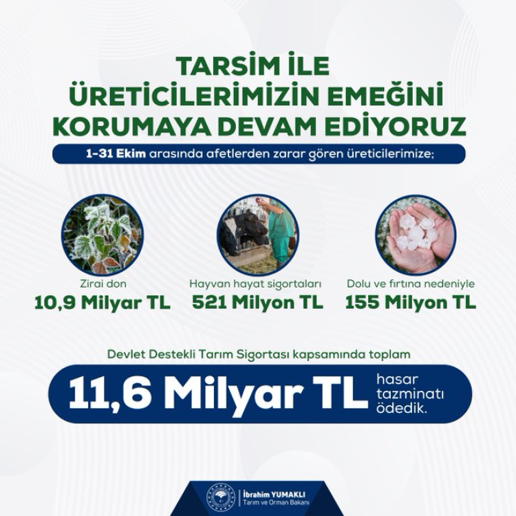 Bakan Yumaklı’nın paylaşımında yer alan bilgilere göre, Ekim ayında zirai don için 10,9 milyar lira, hayvan hayat sigortaları için 521 milyon lira, dolu ve fırtına için de 155 milyon lira ödeme yapıldı.