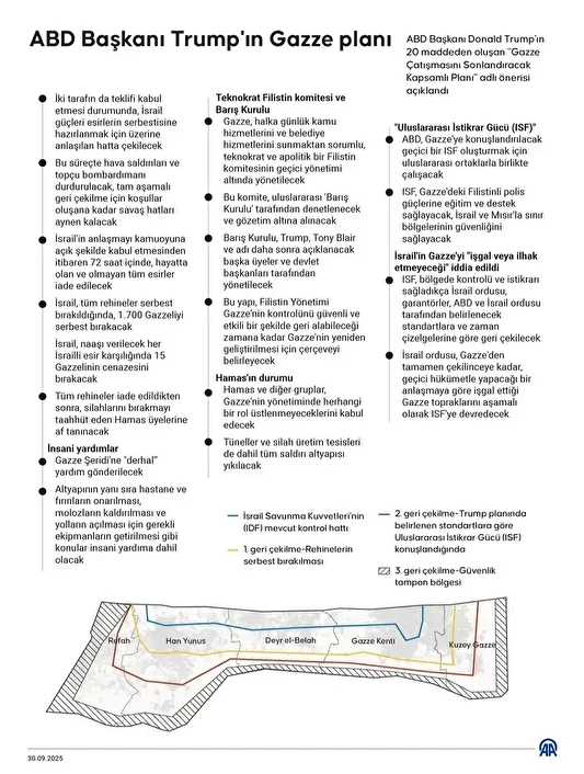 ABD Başkanı Trump, 20 maddelik Gazze planının kabul edilmesi halinde savaşın sona ereceğini, İsrail’in kademeli olarak Gazze’den çekileceğini, Hamas’ın rol almadığı yeni bir sürecin başlayacağını ve tüm esirlerin serbest kalacağını vadetmişti.
