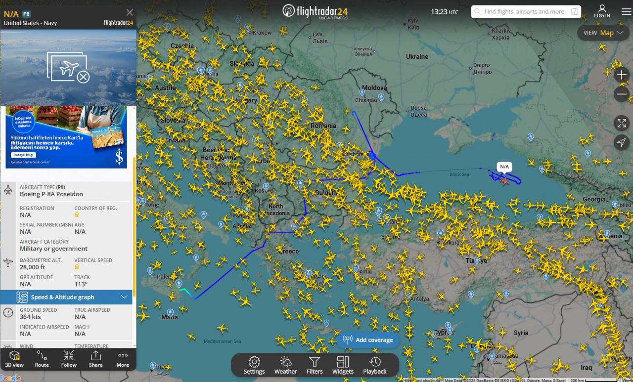 Romanya’nın başkenti Bükreş yakınlarında sortiler atan Boeing P-8A Poseidon, ardından ise Karadeniz’e yöneldi. ABD’nin en gizli radar sistemlerinden biri olan AN/APS-154 Gelişmiş Havadan Algılama Sensörünü (AAS) taşıyan Poseidon şu anda Karadeniz üzerinde sortiler attığı tespit edildi.
