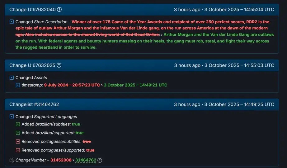 Söylentilerin alevlenmesine neden olan gelişme, bir Twitter/X kullanıcısı olan BeskInfinity’nin Red Dead Redemption 2’nin SteamDB girişindeki mağaza açıklamasında yapılan beklenmedik ve önemli bir değişikliği fark etmesiydi. Ödüller ve Red Dead Online erişimine odaklanan önceki metin, oyunu daha derinlemesine pazarlayan ve daha zengin ve tematik bir açıklama ile değiştirilmişti.
