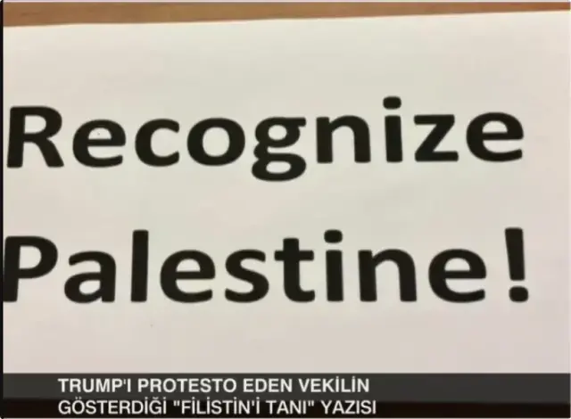 Trump konuştuğu sırada milletvekilleri Filistin asıllı Ayman Odeh ile Ofer Cassi “Filistin’i tanıyın” sloganları attı. Haaretz gazetesi, sol kanat milletvekillerinin aynı zamanda “Filistin’i tanıyın” pankartı açtığını yazdı. Jerusalem Post (JP) gazetesi, pankartlardan birinde “soykırım” ifadesinin yazdığını bildirdi. JP, iki milletvekilinin Trump’a terörist diye bağırdığını aktardı. Milletvekillerinin salondan çıkarılmasının ardından konuşmasına yeniden başlayan Trump, protestoyu kast ederek “Çok etkiliydi” dedi.