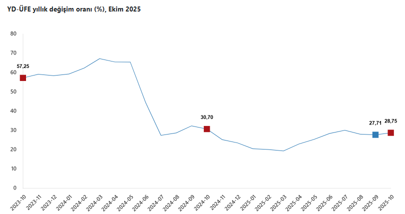Türkiye İstatistik Kurumu ekim ayı Yurt Dışı Üretici Fiyat Endeksi (YD-ÜFE) rakamlarını açıkladı. Buna göre YD-ÜFE 2025 yılı Ekim ayında bir önceki aya göre yüzde 0,90 artış, bir önceki yılın Aralık ayına göre yüzde 28,69 artış, bir önceki yılın aynı ayına göre yüzde 28,75 artış ve on iki aylık ortalamalara göre yüzde 25,13 artış gösterdi.